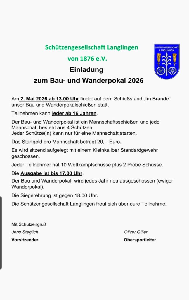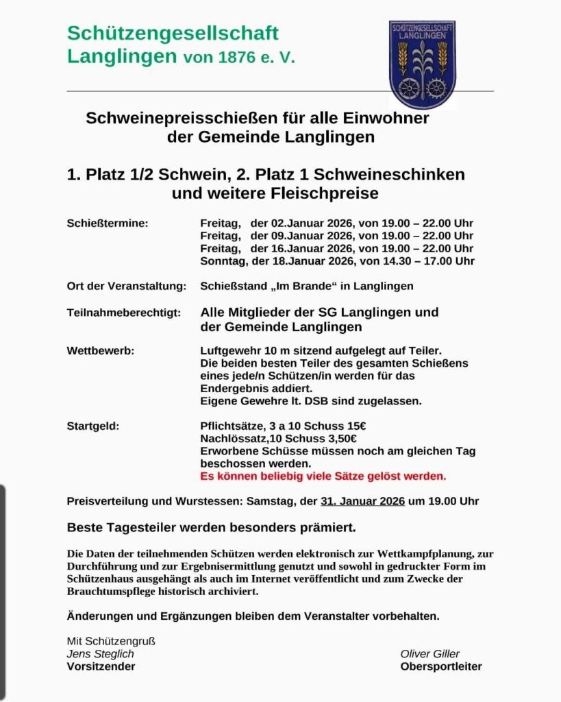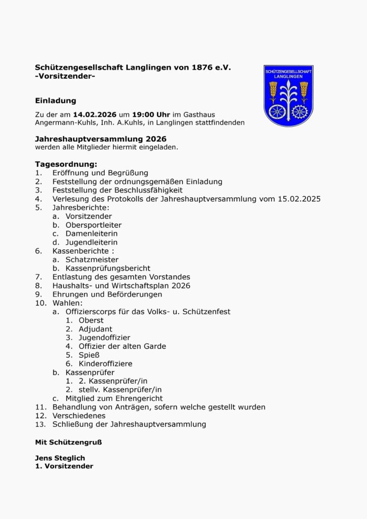 Am 14. Februar 2026 fand die Jahreshauptversammlung der Schützengesellschaft Langlingen von 1876 e.V. im Gasthaus Angermann-Kuhls statt. Der 1. Vorsitzende Jens Steglich eröffnete die Versammlung und begrüßte herzlich alle anwesenden Mitglieder, darunter Vizekönig Ramon Münch, Jugendkönigin Jette Gerlof, die 1. Damenbeste Birgit Angermann-Kuhls, die 2. Damenbeste Sara Koch, die 3. Damenbeste Daniela Münch, sowie die Ehrenmitglieder Marie-Luise Belke, Brigitte Woop, Margarete Gerlof und Bürgermeister Ernst-Ingolf Angermann. Um den verstorbenen Mitgliedern, insbesondere Ilse Deister, die Ehre zu erweisen, wurde eine Gedenkminute eingelegt.