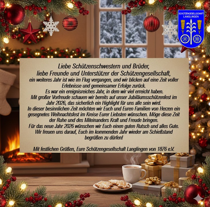 Was für ein spannender Abend! Am Freiteg, den 19.12.2025, fand nach dem lebendigen Adventkalender unser traditionelles Tannenbaumschießen statt. Bei festlicher Stimmung und strahlenden Gesichtern traten 25 Teilnehmer an, um die drei wunderschönen Tannenbäume auszuschießen. 1. Platz Norbert Manske 2. Platz Melina Stephenson 3. Platz Frauke Meyer Ein besonderer Dank geht auch in diesem Jahr an die Familie Woop für die großzügige Spende der Tannenbäume! Und wir gratulieren Marcel Rosner, der dieses Jahr die Rote Laterne erhielt.
